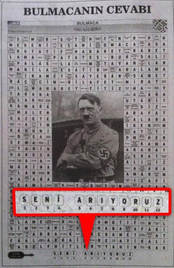 Gazetedeki bulmacada ‘resimdeki ünlü’ olarak Adolf Hitler yer alırken, şifreli sözcük ise ‘Seni Arıyoruz’ olarak çıktı.
